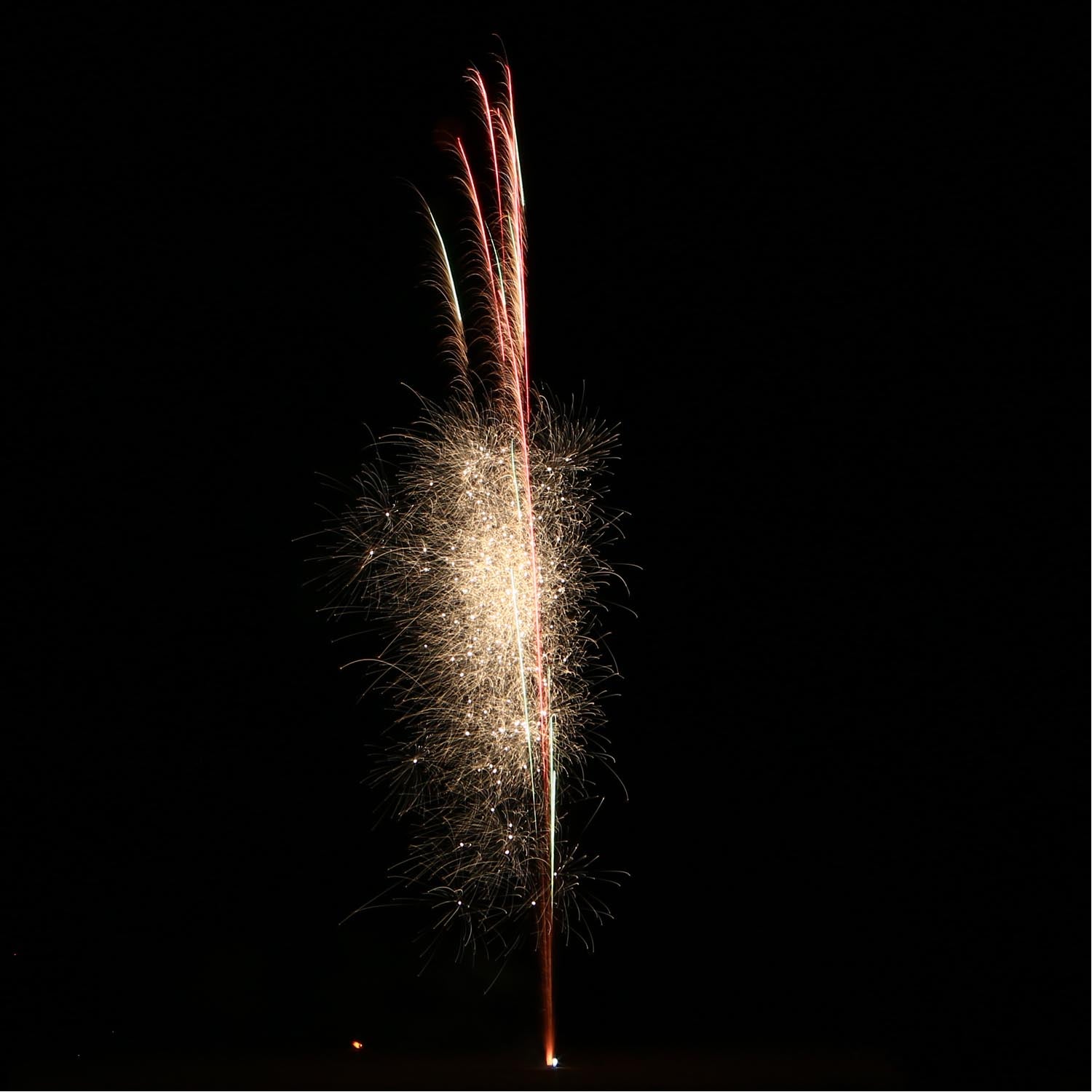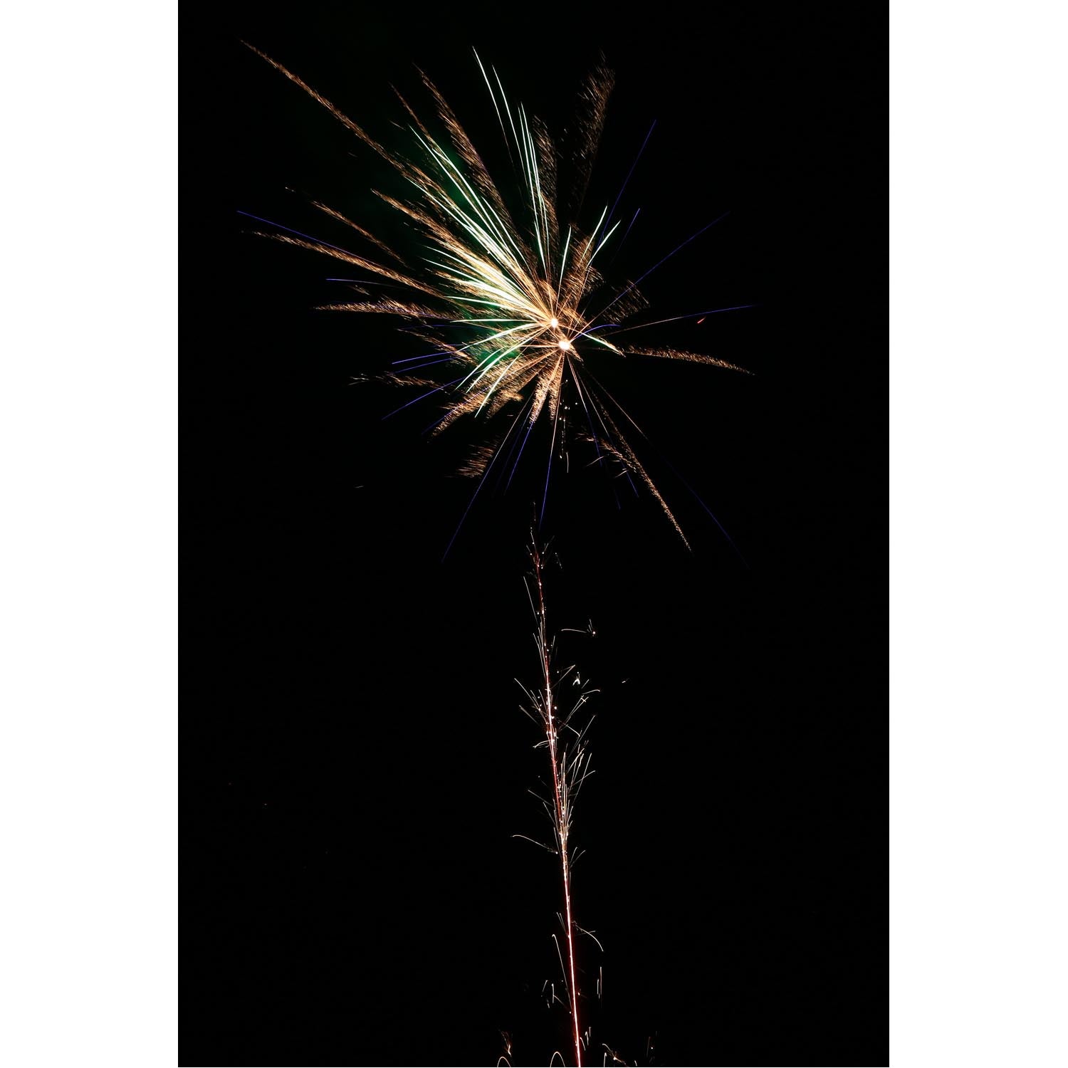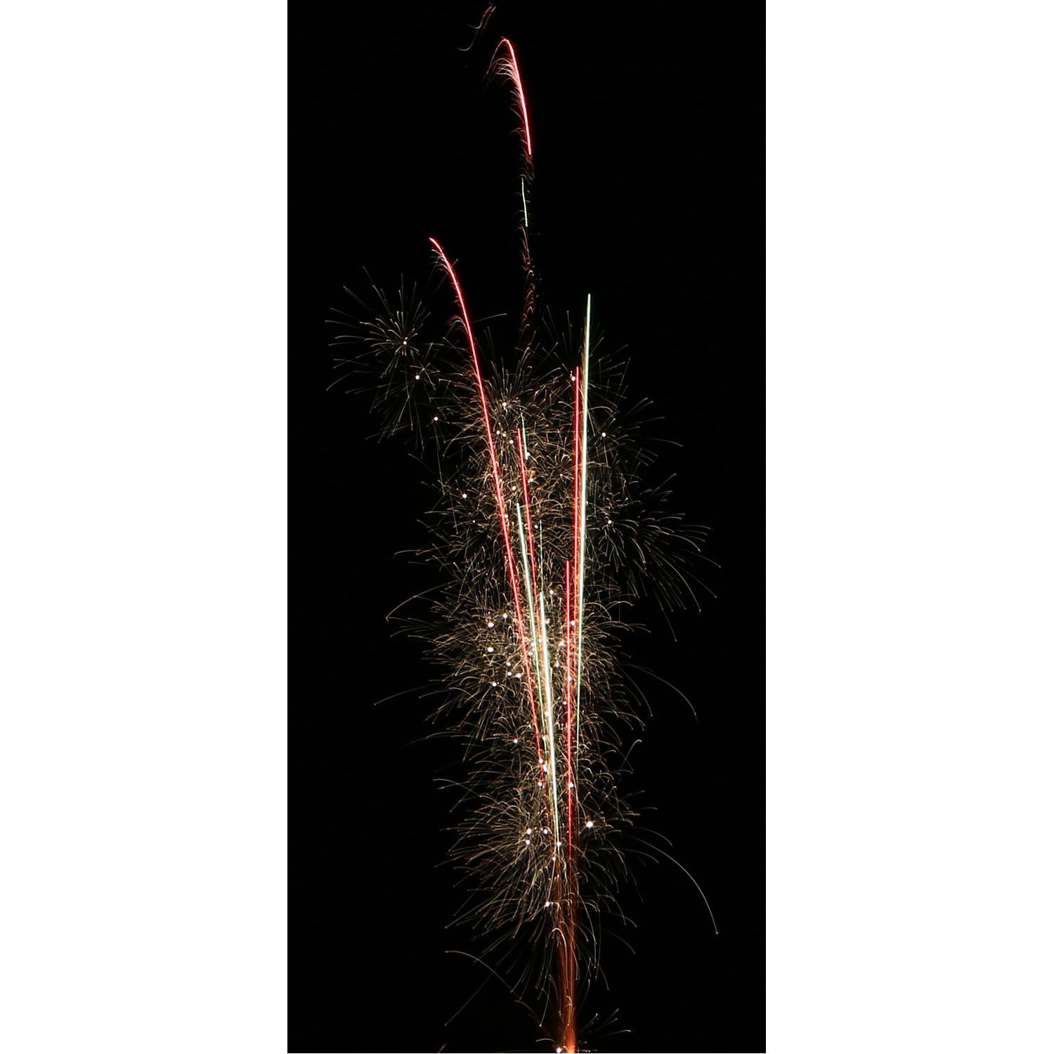100 Schuss mit roten, grünen, gelben oder blauen Leuchtsternen und unzähligen Crackling-Effekten.