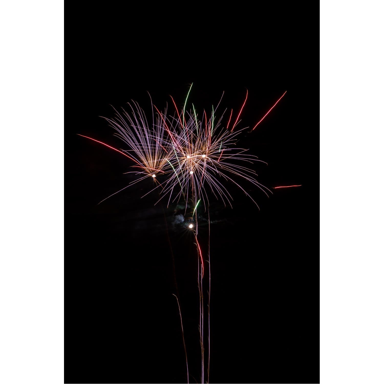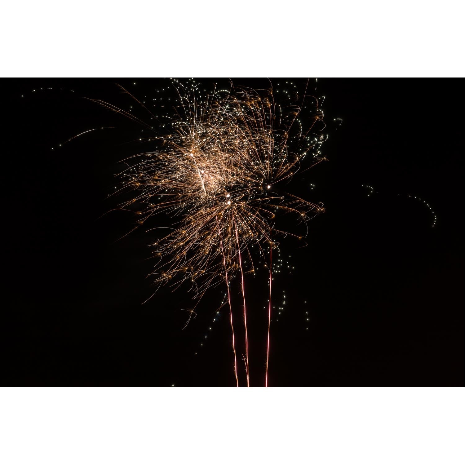 25 Schuss, mit rotem, blauem oder silbernem Schweif aufsteigend und anschließender Verwandlung zu farbenfrohen Sternenbuketts. Unterbrochen von zwei golden aufsteigenden 3-Schuss-Fächern mit anschließender Verwandlung zu Brokatkronen-Fächern. Abschließend eine rot aufsteigende 4-Schuss-Salve mit lautstarker Verwandlung zu knisternden, silbernen Time-Rain-Effekten.